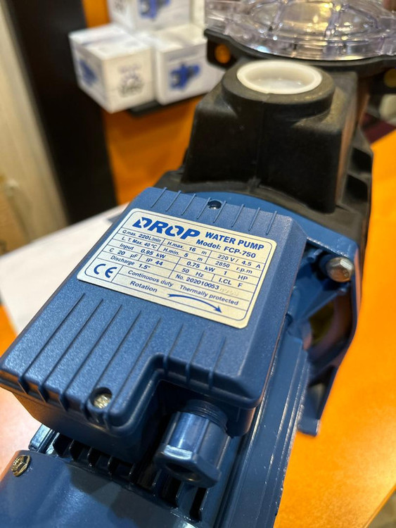 پمپ استخری 1 اسب استرینر دار دراپ مدل DROP-FC750 دارای قدرت موتور 1 اسب بخار، حداکثر ارتفاع 16 متر و حداقل ارتفاع 5 متر، با دبی حداکثر 13.2 متر مکعب بر ساعت و دهانه ورودی و خروجی 2 اینچ است. این پمپ دارای موتور 2850 دور بر دقیقه، توان ورودی 2 کیلووات، خازن 30 میکروفاراد و بسامد 50 هرتز است. همچنین این پمپ برای چرخش و سیرکوله آب در استخرها، جکوزی ها و حوضچههای آب سرد مناسب است و در مقابل خورندگی آب همراه با کلر یا نمک بسیار مقاوم است.